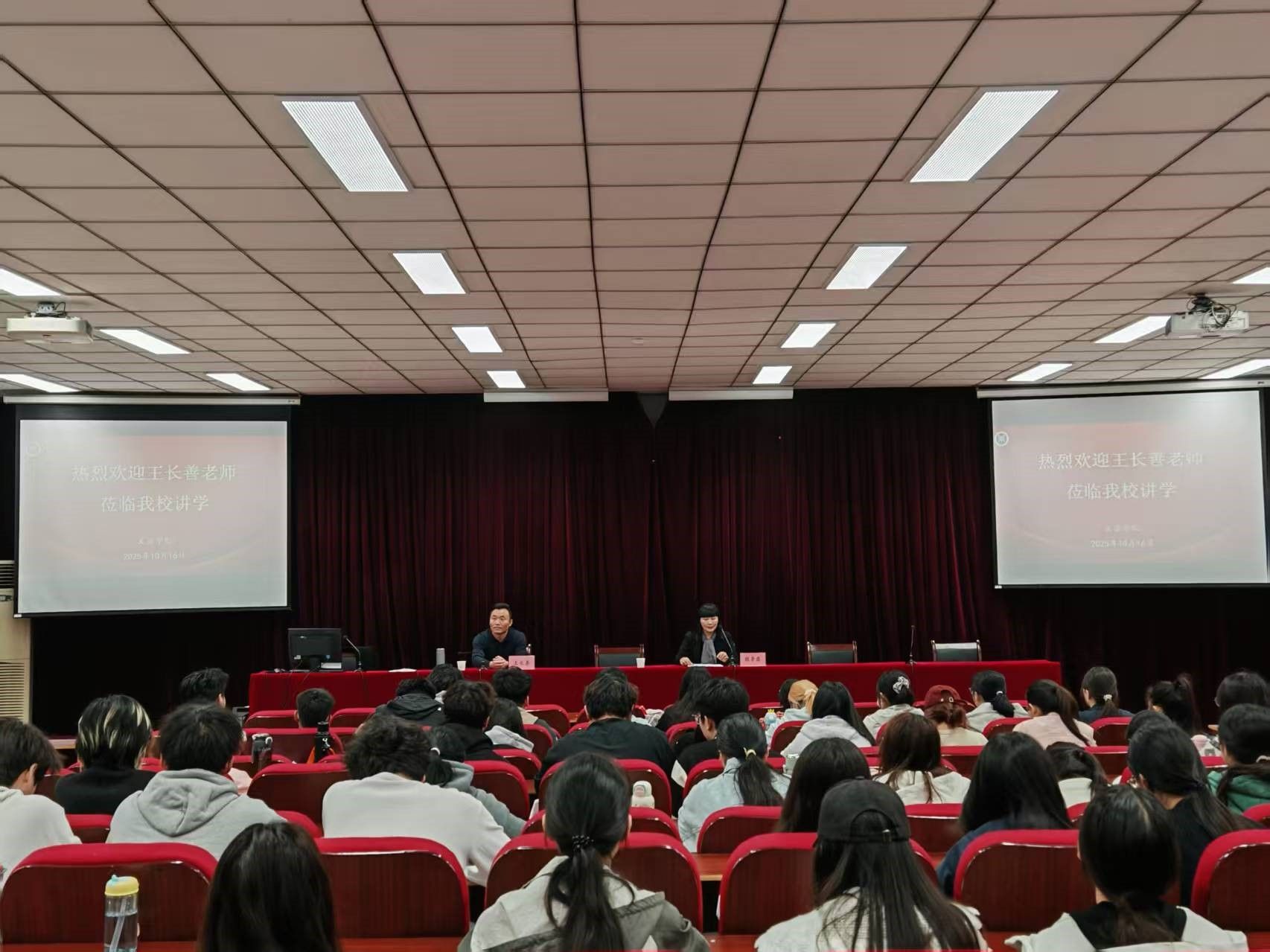 在互动环节,王长善鼓励学生“找到兴趣点,一点一滴积累”。他引用俞孔坚毕业致辞中的寄语,希望学子保有“肉眼凡胎的眼睛”和“倾听土地与人民声音的心”,并送给现场学子的“敬、静、净、竞、镜”五字箴言,将讲座推向高潮。